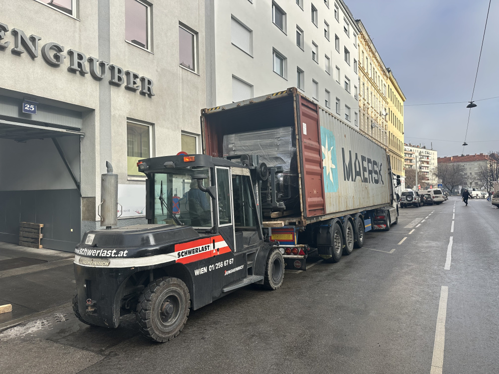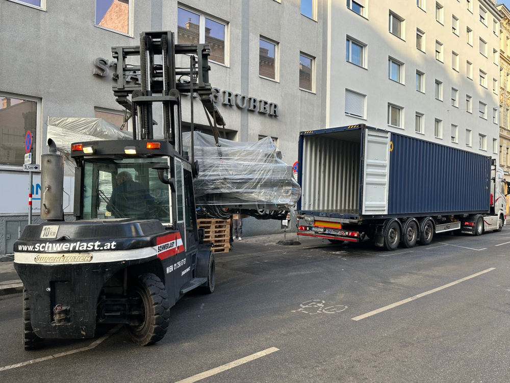 Atraktiven 10 barvni offset tiskarski stroj Heidelberg SM 102-10P z lak agregatom je prodan stranki v Afriko. Demontaža in naklad stroja sta se dogajala v centru mesta Dunaj in je projekt zahteval specifično pripravo in izvedbo.